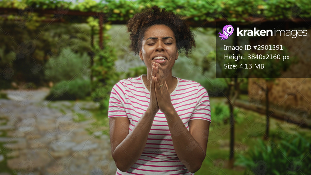 Woman praying with hands pressed and closed eyes in a forest park setting wearing striped shirt and ring; hope healing.