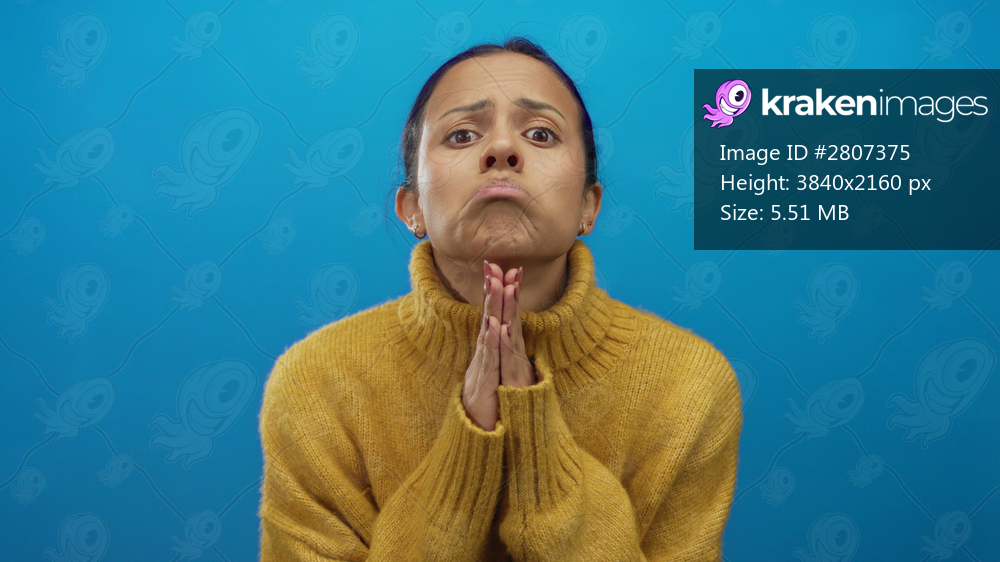 Woman praying with hopeful expression in yellow sweater against bright blue wall suggests anticipation and longing