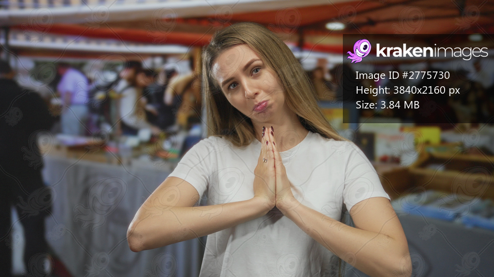 Woman praying in a bustling outdoor market scene showcasing diverse stalls and vibrant city life.