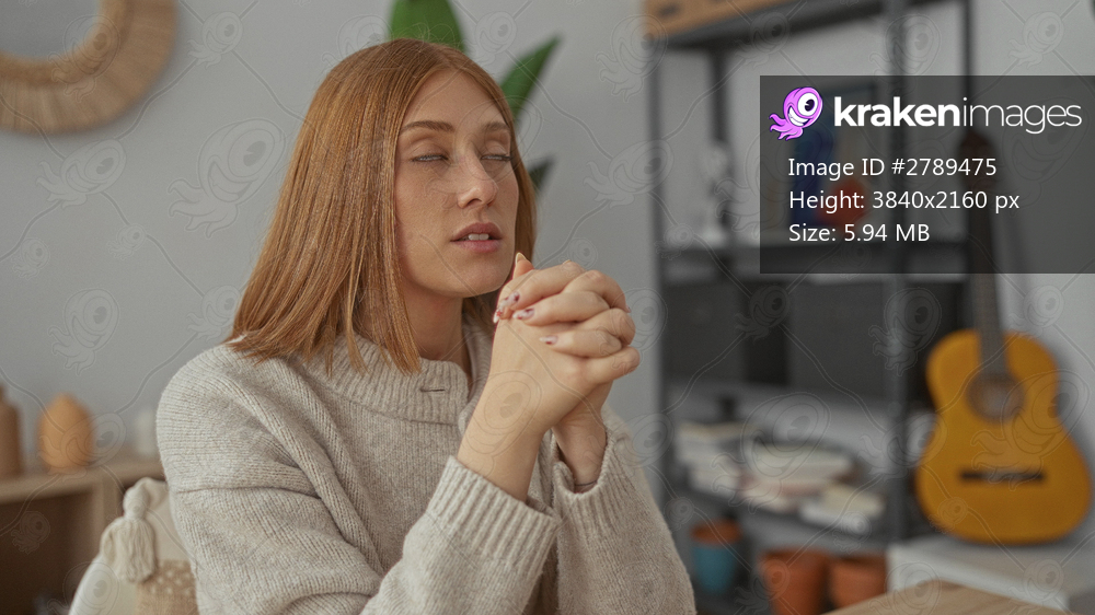 Woman praying in living room with hands clasped and eyes closed, wearing cozy sweater, surrounded by books and guitar in a peaceful home setting.