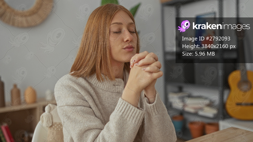 Woman praying in living room with hands clasped and eyes closed, wearing cozy sweater, surrounded by books and guitar in a peaceful home setting.