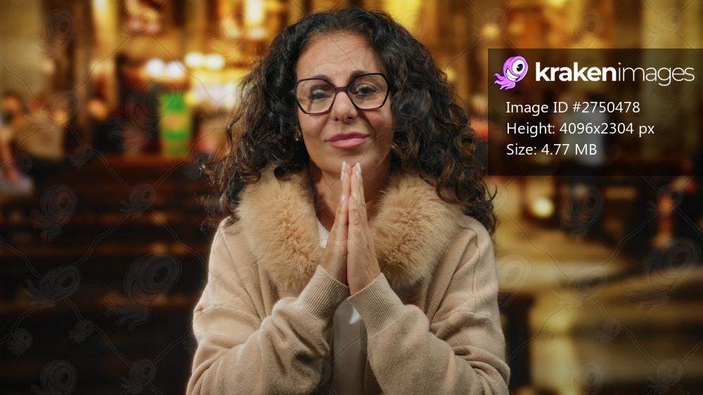 Woman praying indoors, in a warm coat, with hands clasped, surrounded by the serene ambiance of a dimly lit church showing faith and reflection.