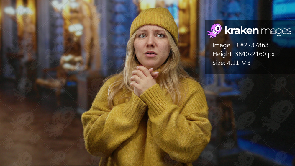 Woman praying inside ornate church wearing yellow knit hat and sweater with a concerned expression in an indoor setting