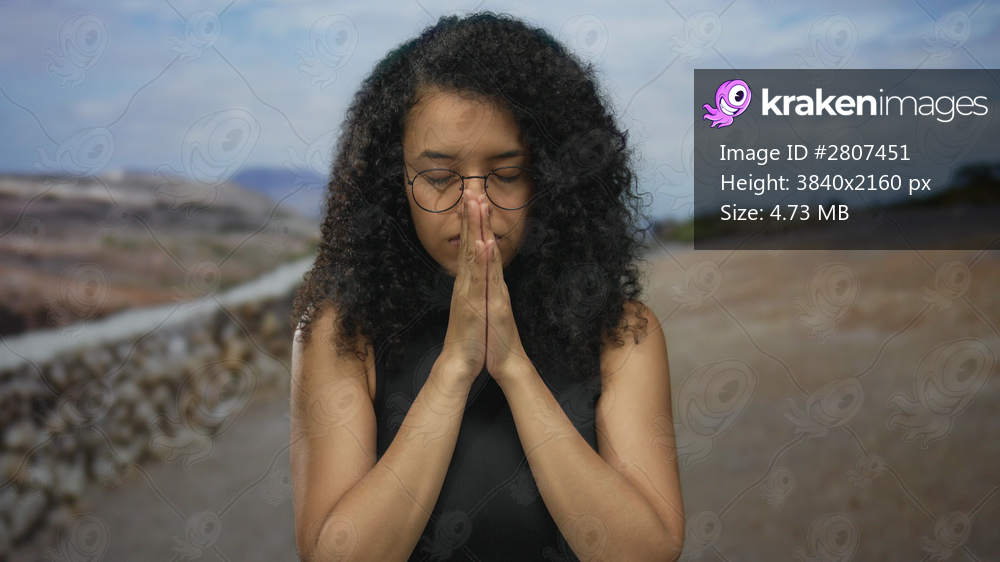 Woman praying outdoors with curly hair, wearing glasses, and a black shirt against a scenic nature backdrop under a cloudy sky, portraying a sense of calm and spirituality. - Kraken Images