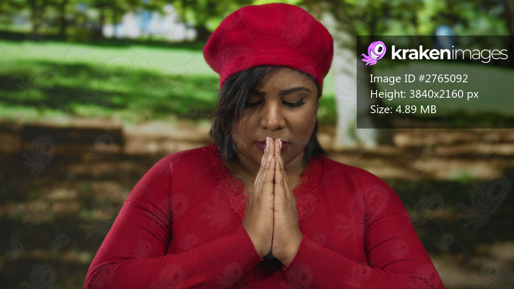 Woman praying outdoors in a serene park setting, wearing a red beret and sweater, exuding a sense of peace and contemplation, surrounded by vibrant green nature. - Kraken Images