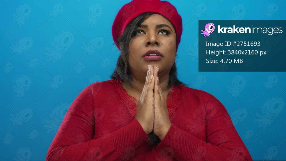 Woman praying wearing red beret and sweater, standing against a vibrant blue background, expressing hope and faith with closed eyes.