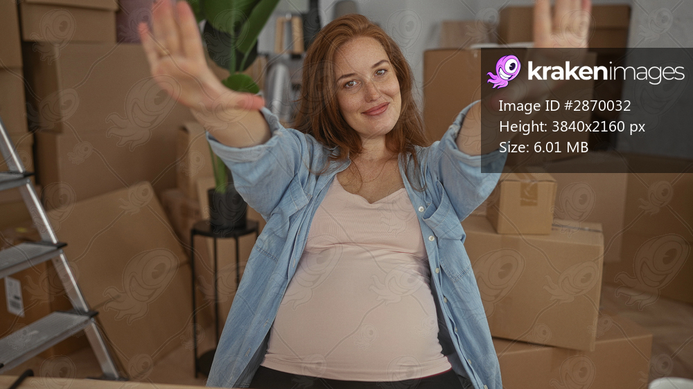 Woman with pregnant belly making hand heart gesture amid moving cardboard boxes in bright house; joy anticipation hope.