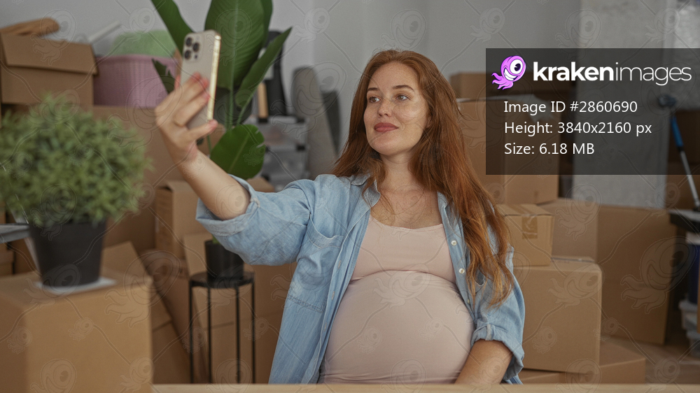 Woman with pregnant belly waving hand and holding smartphone inside new building; family anticipation.