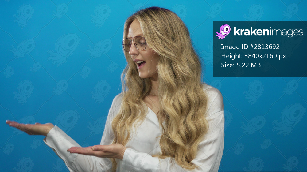 Woman presenting confidently with long blonde hair against isolated blue background wall smiling in white shirt adding warmth elegance and professionalism with expressive gestures - Kraken Images