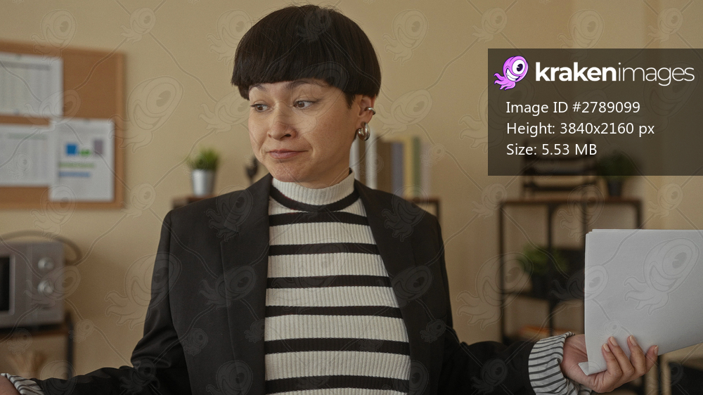 Woman presenting data in office with documents and charts in a formal meeting, wearing black blazer and striped sweater, surrounded by shelves and plants. - Kraken Images