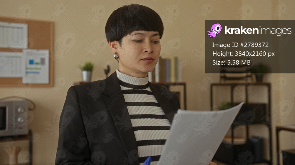 Woman presenting data in office with documents and charts in a formal meeting, wearing black blazer and striped sweater, surrounded by shelves and plants. - Kraken Images