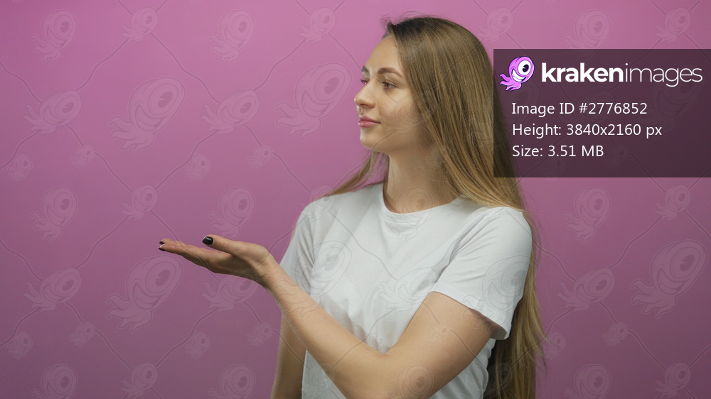 Woman presenting different options with open palm against isolated pink background wearing a casual white shirt showcasing young confident expression and offering choices. - Kraken Images