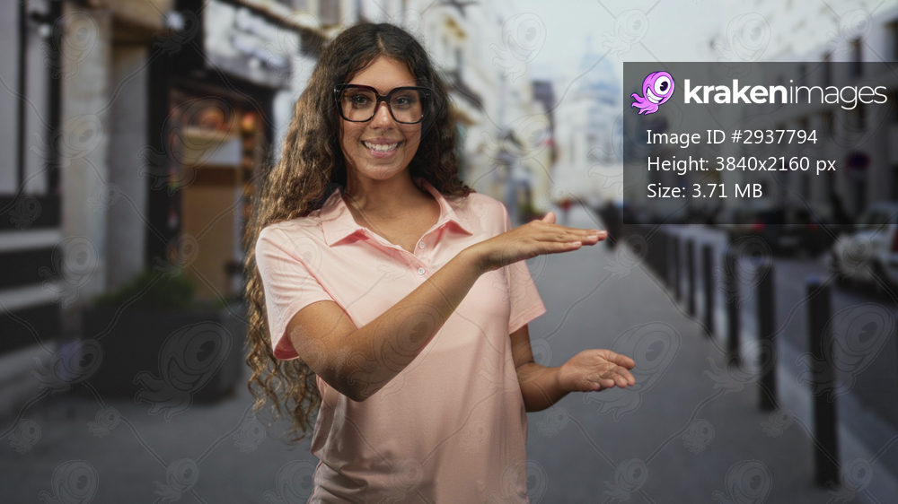 Woman presenting hands palms up on city street with glasses and pink polo, smiling while gesturing to an empty space; friendly welcome.