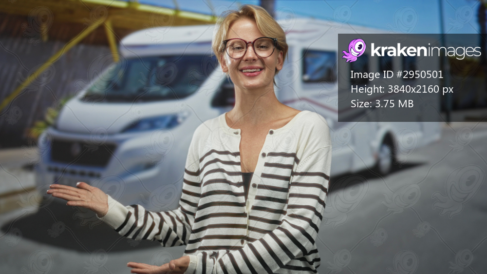 Woman presenting motorhome on street with open palms and smiling expression, wearing striped cardigan and glasses; travel joy.