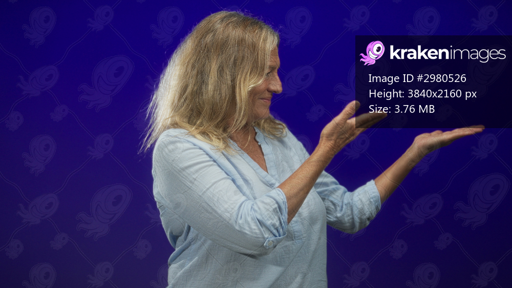 Woman presenting open hand gesture in studio wearing a light blouse against a blue backdrop; contentment generosity.