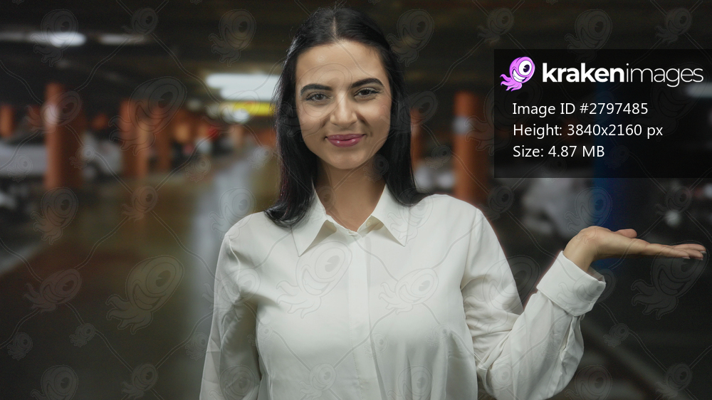 Woman presenting with open hand in an indoor parking lot featuring cars in the background, dressed in a white shirt, expressing confidence and focus.