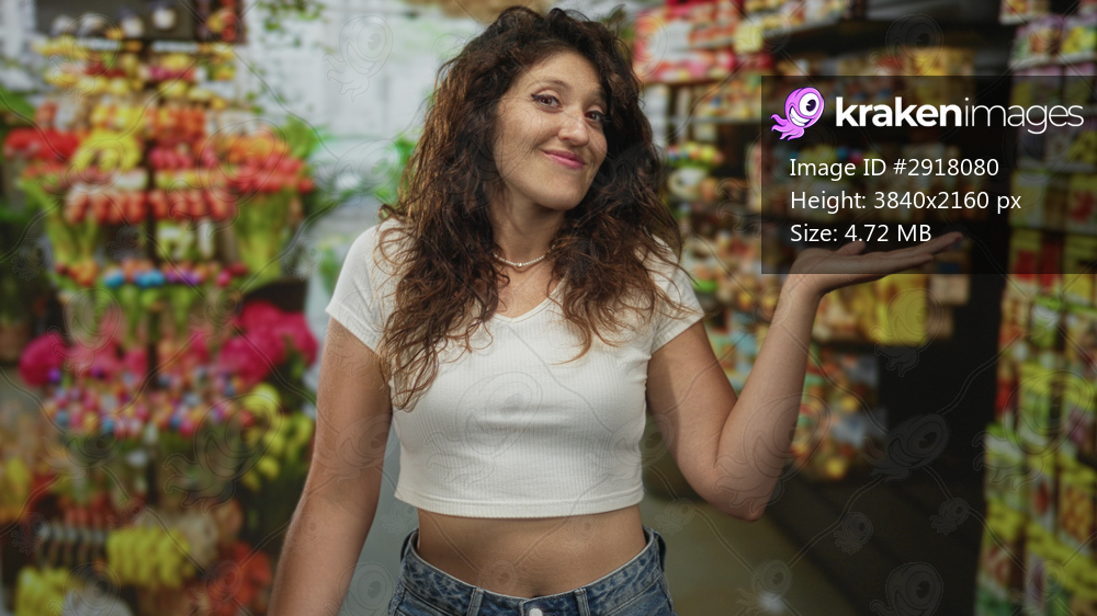 Woman presenting open hand palm in a building flower shop, smiling and looking at her palm while wearing jeans and a white top; playful curiosity.