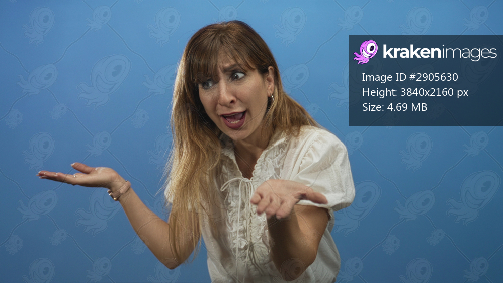 Woman presenting open hand palm up in studio with blue backdrop, smiling and offering gesture; friendly welcome.