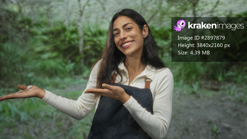 Woman presenting open hand and winking in a forest setting wearing denim apron and long sleeves; playful approachable.