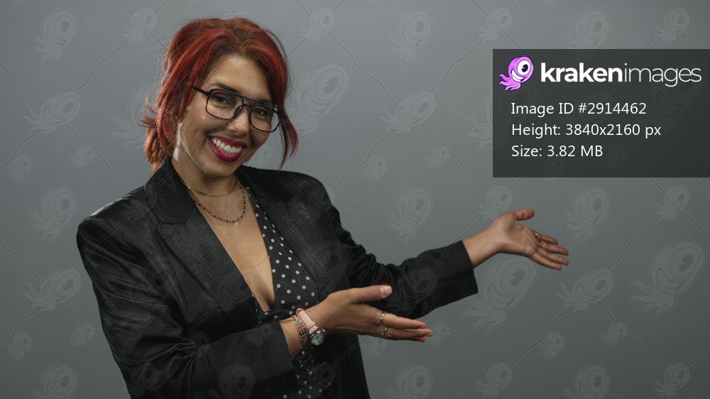 Woman presenting open hands in grey studio, smiling and wearing glasses and black blazer with polka dot top; confidence welcome presentation.