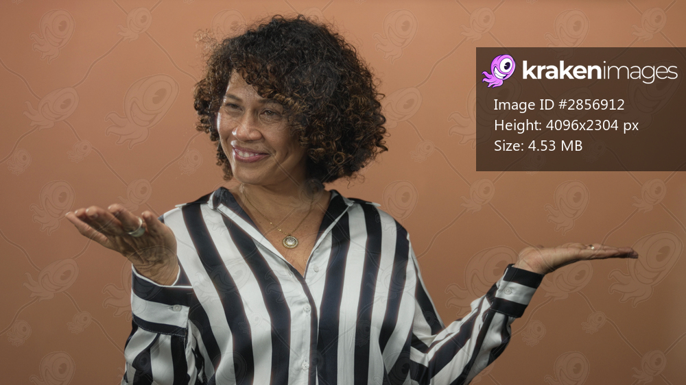 Woman presenting open hands palms up in studio with peach wall wearing striped blouse and pendant necklace; curiosity.
