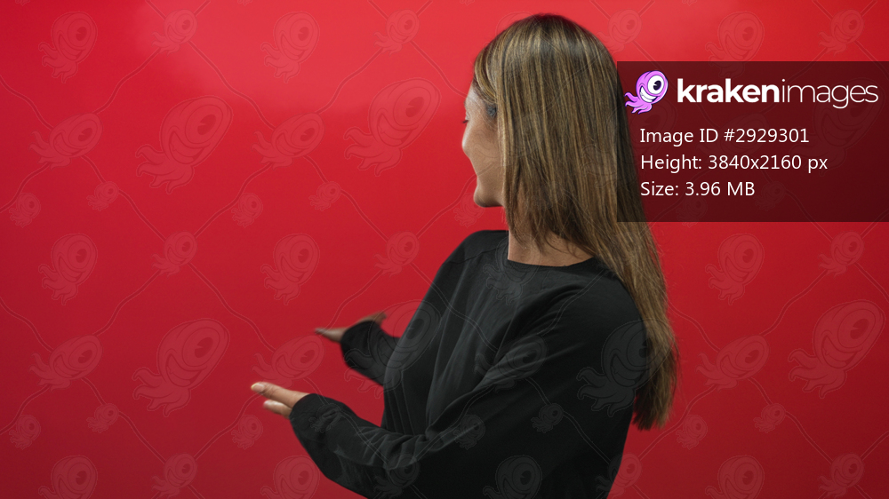 Woman presenting open hands and smiling in profile against a vivid red studio wall, wearing gold earrings; joy friendly engagement.
