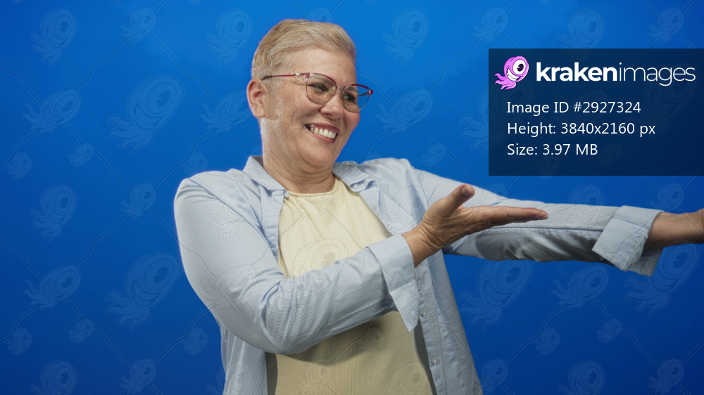 Woman presenting open palm gesture and smiling in studio with blue backdrop; cheerful welcome presentation.