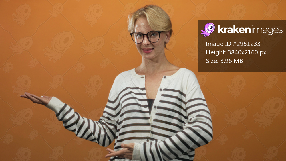 Woman presenting open palm hand and smiling, wearing glasses and striped cardigan in studio orange backdrop; invitation confidence.