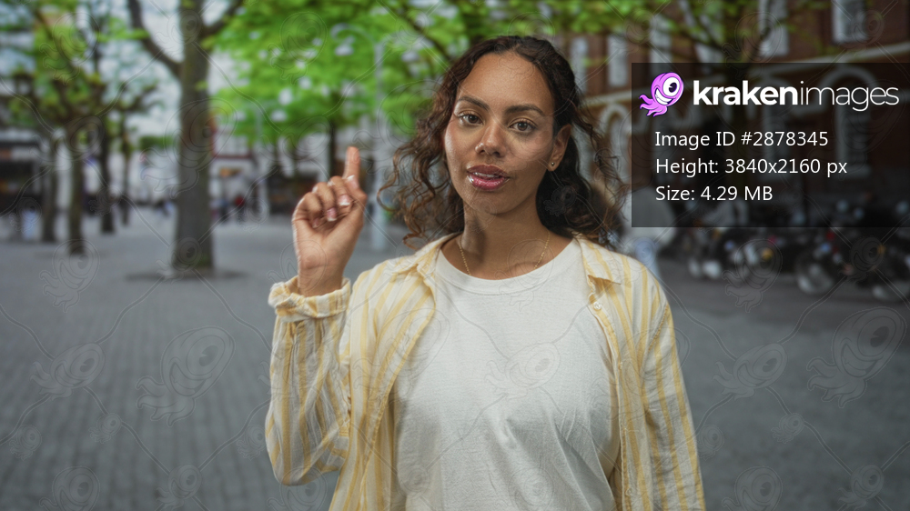 Woman presenting open palm on a city street in a yellow striped shirt, slight smile and relaxed pose facing camera; invitation confident.