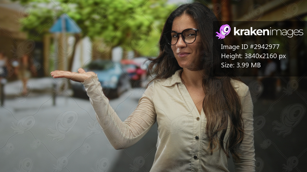 Woman presenting open palm on a city street, wearing glasses and beige shirt, smiling at camera; welcoming invitation.