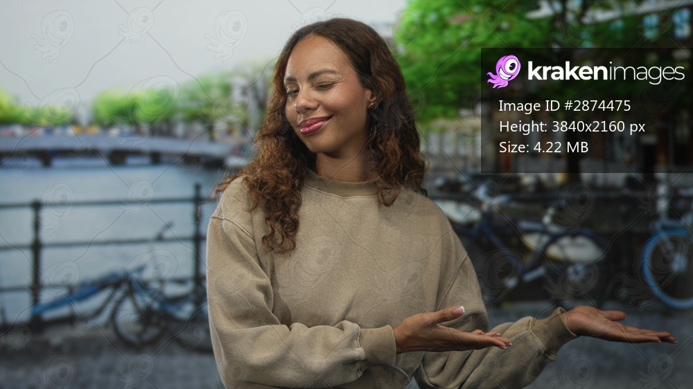 Woman presenting open palms and giving a thumbs up on a street by an amsterdam canal with bikes and railing visible; confidence welcome.