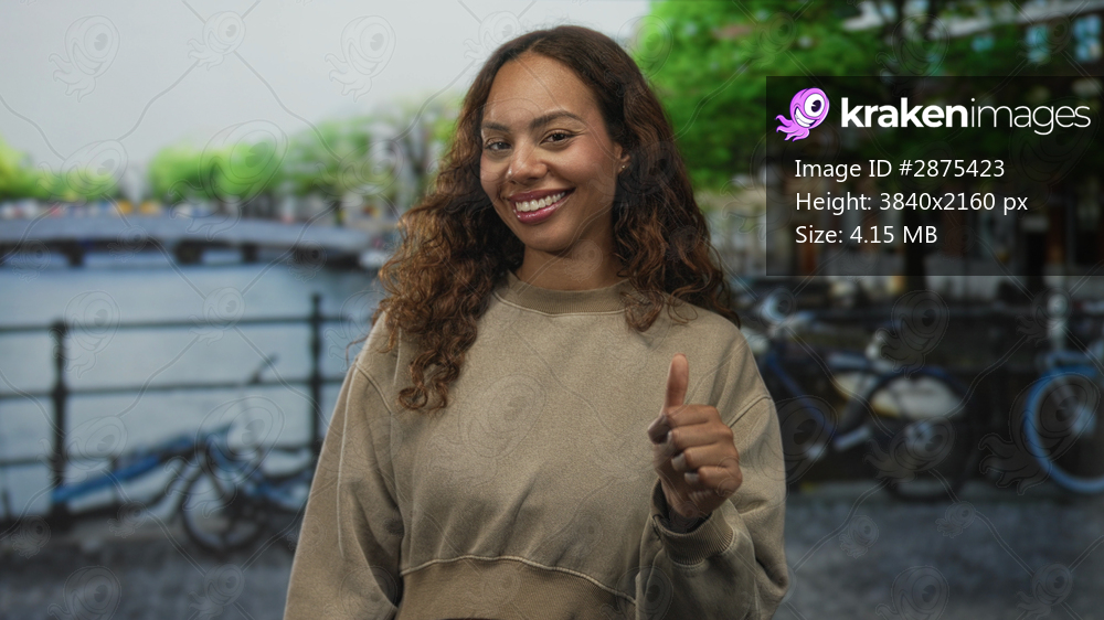 Woman presenting open palms and giving a thumbs up on a street by an amsterdam canal with bikes and railing visible; confidence welcome.