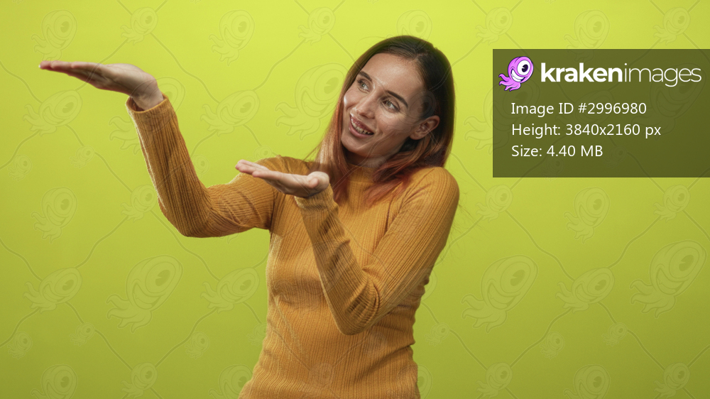 Woman presenting open palms and hands with a smiling face in studio, gesturing as if holding an invisible object; playful curiosity.