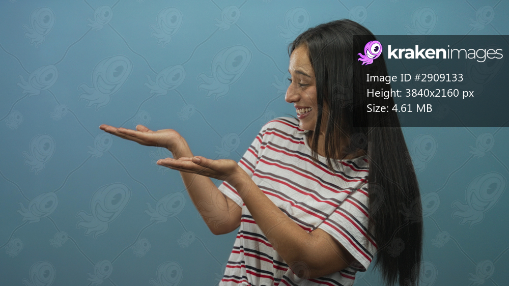 Woman presenting open palms in blue studio while wearing striped shirt and looking at hands; joy sharing.