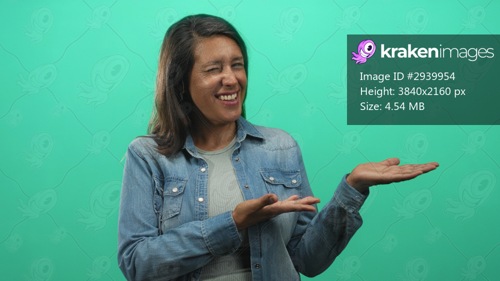 Woman presenting open palms in studio with denim shirt, smiling and holding both hands forward; friendly invitation.