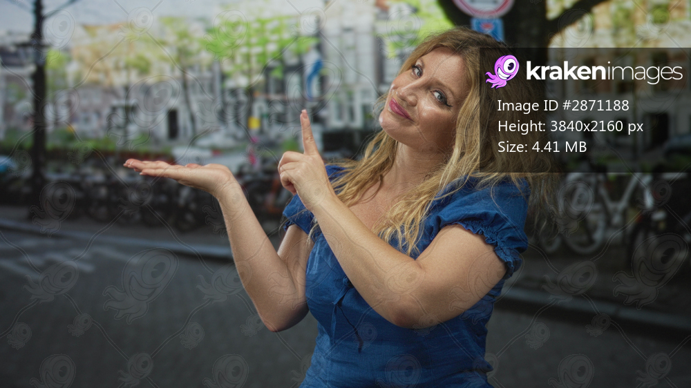 Woman presenting open palms on a street with parked bicycles, wearing blue dress and showing hands and shoulders; skepticism curiosity.