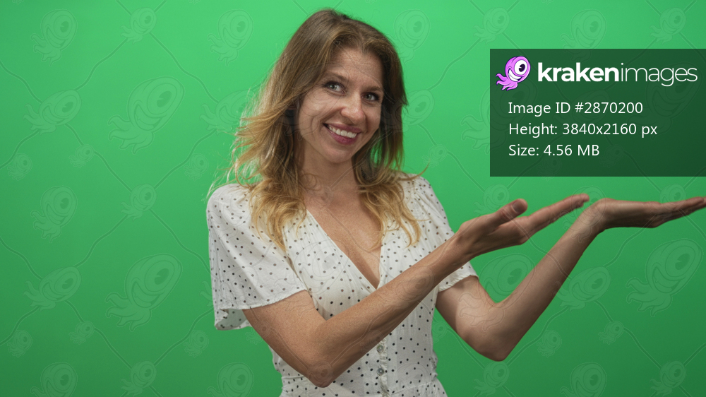 Woman presenting open palms and smiling in green studio, arms extended and engaging gesture; welcoming invitation demo.