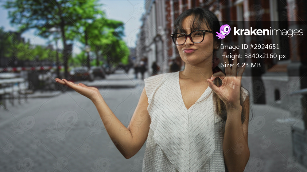 Woman presenting with outstretched palm and thumbs up gesture on street beside brick building; confidence presentation.