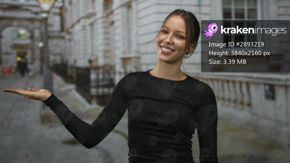 Woman presenting palm on a city street by a historic stone building, smiling and posing with open hand gesture; friendly welcome.
