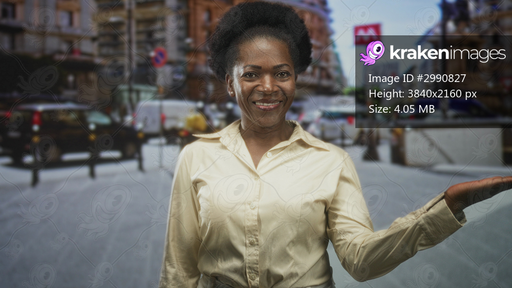 Woman presenting palm with open hand gesture on a busy city street near a metro entrance, smiling at camera and gesturing; welcoming guidance.