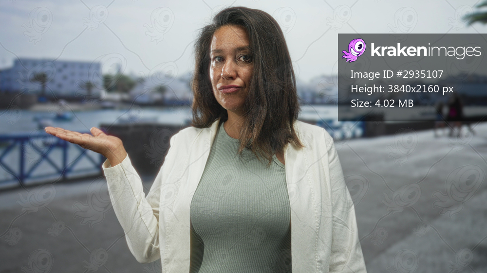 Woman presenting palm up gesture on a seafront street with nearby blue railing and boats; doubt curiosity.