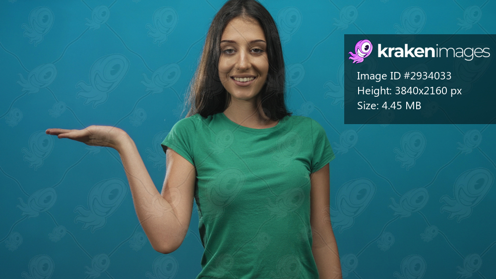 Woman presenting palm up in studio teal backdrop, wearing green t shirt, smiling and looking at her hand; confidence.