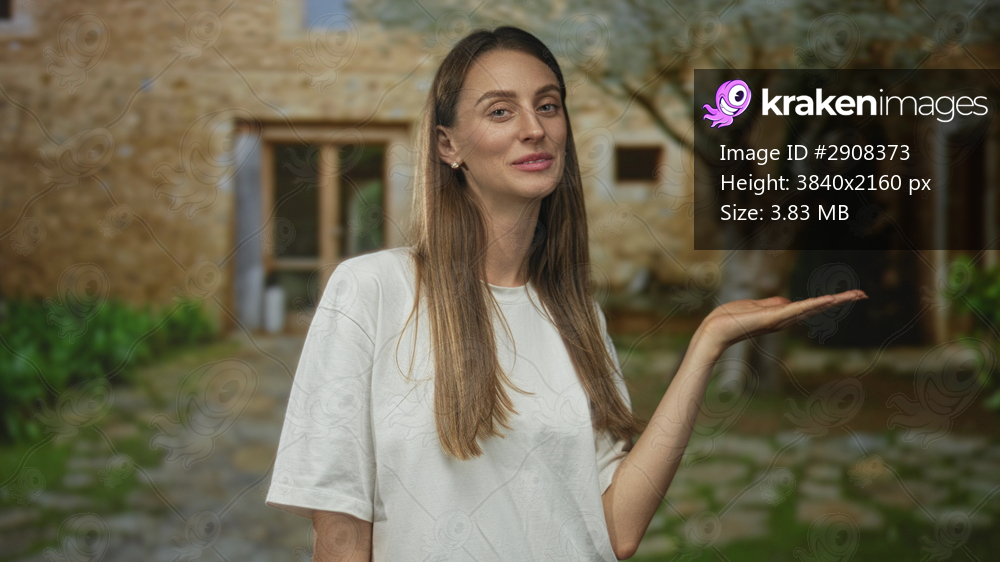 Woman presenting palm up and smiling at stone house entrance building, holding out hand in greeting; welcome warmth comfort.