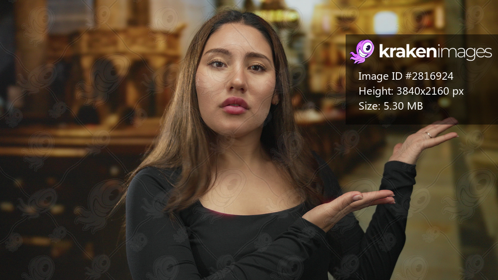 Woman presenting palms beside wooden pews under soft light in building with blurred altar and stained glass windows; reflection serenity peace invitation. - Kraken Images