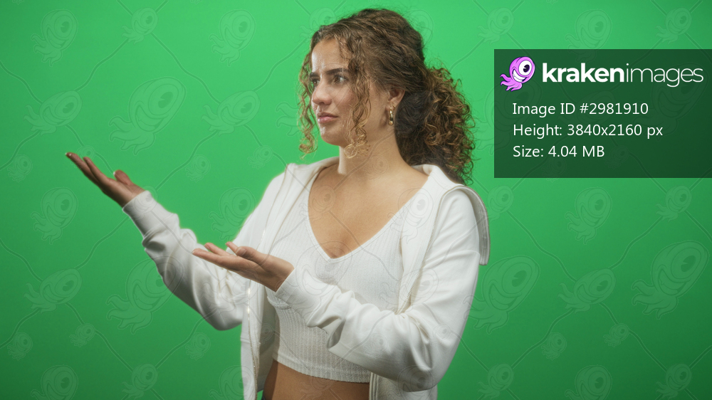 Woman presenting with palms up and exposed midriff in a green screen studio, white hoodie visible; curiosity invitation.