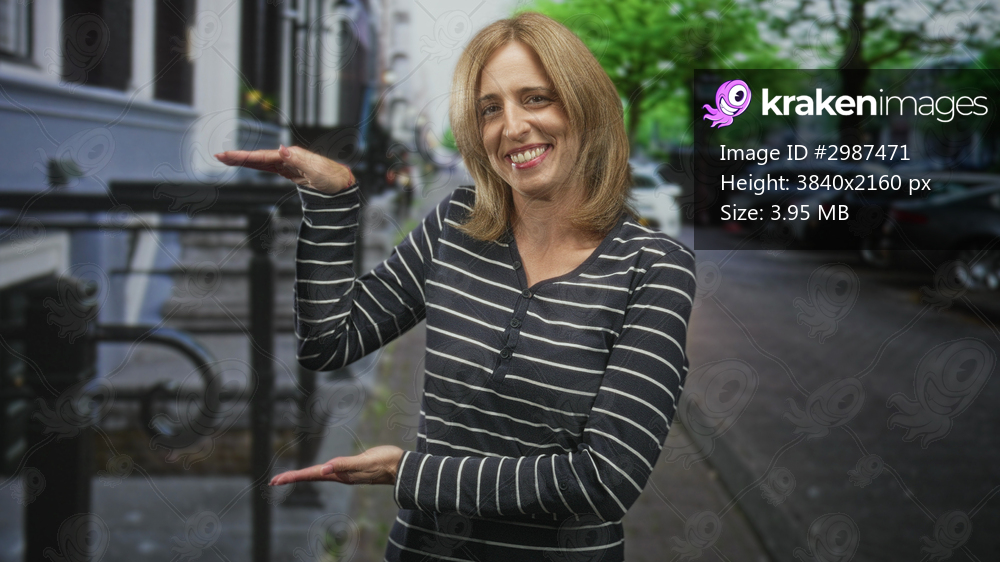 Woman presenting with palms up and smiling, framing an empty space beside parked cars and iron railing on a city street; joyful presentation.