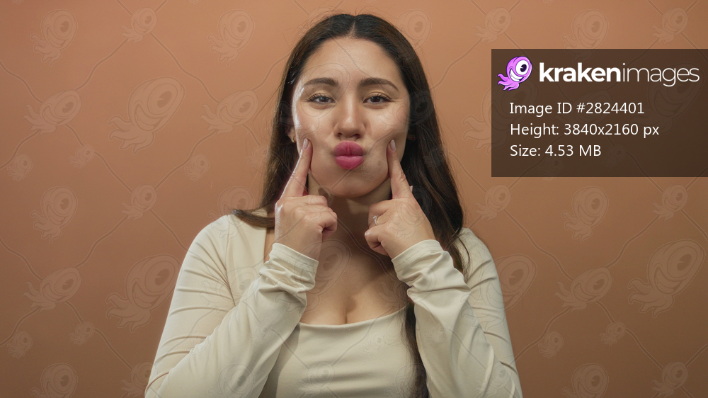 Woman presses cheeks with both fingers and pouts lips against a beige studio backdrop; playful expression.