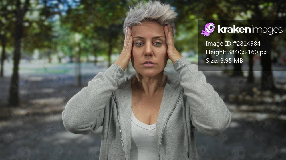 Woman presses forehead for headache in forest while wearing gray sweatshirt amid blurred green trees; stress.