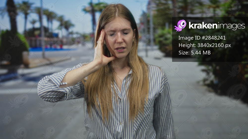 Woman presses forehead with hand, closes eyes and tilts head back on urban street sidewalk under midday sun; discomfort.