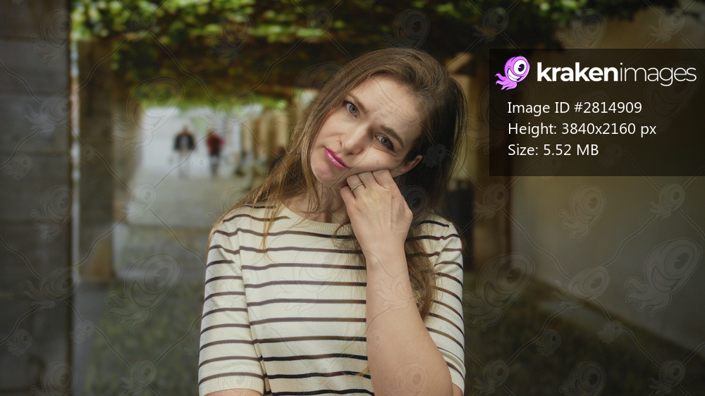 Woman presses hand to cheek while leaning against building wall under vine canopy; toothache discomfort.